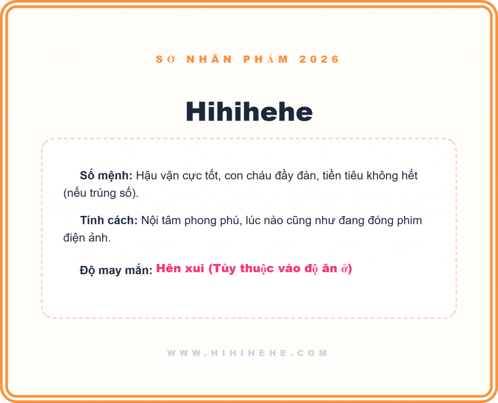 Bạn có bao giờ thắc mắc tại sao mình nỗ lực hết mình nhưng ví tiền vẫn… “gầy”? Hay tại sao mình hiền như cục đất mà thị phi vẫn bám đuổi? Đã đến lúc gạt bỏ những lo âu và đối diện với sự thật bằng công cụ Máy Quét Nhân Phẩm & Số Phận tại hihihehe.com!